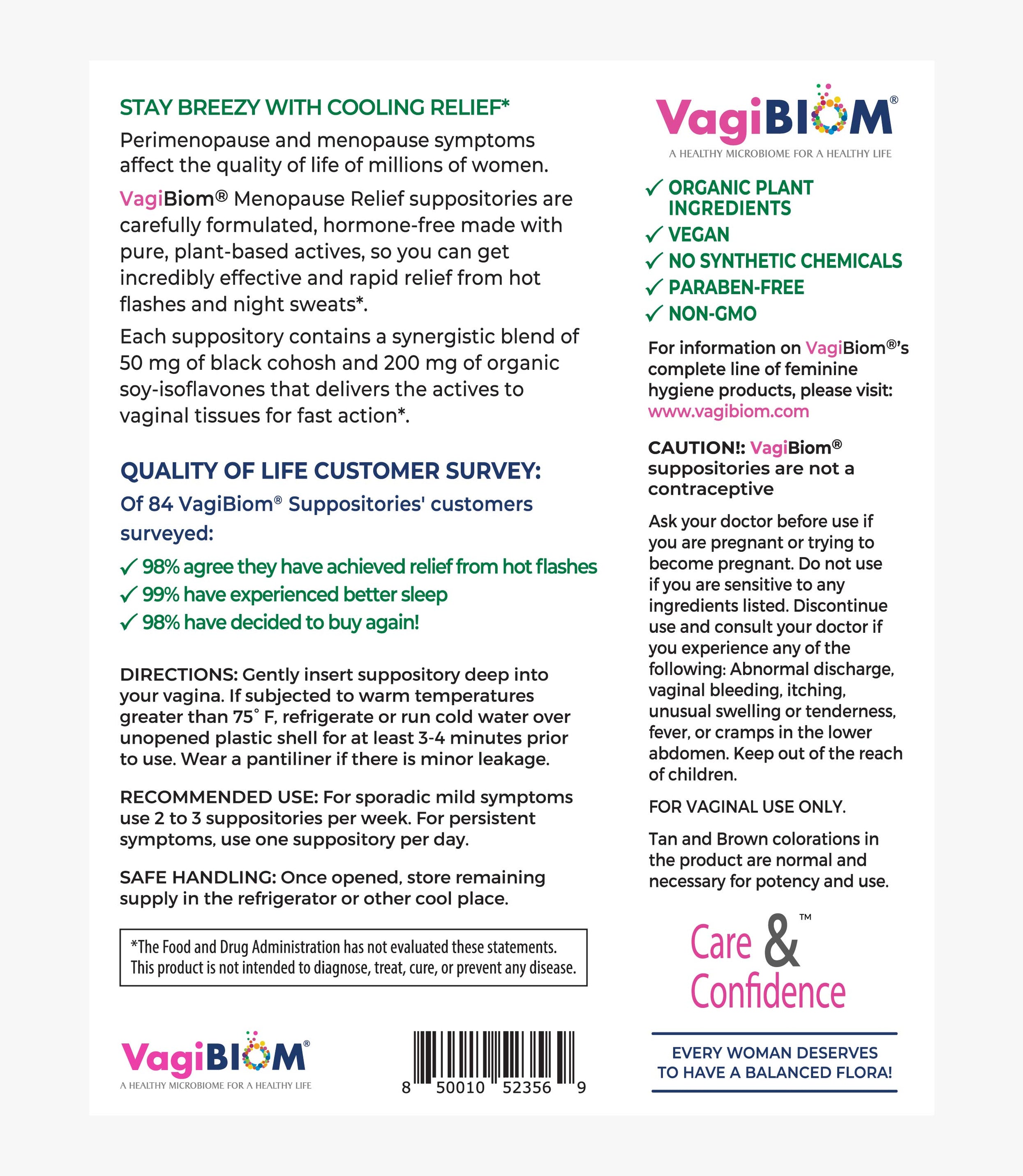 VagiBiom® Menopause Relief Suppositories combine the power of Black Cohosh and Isoflavones in a soothing, oil-based formula to help alleviate menopause symptoms.