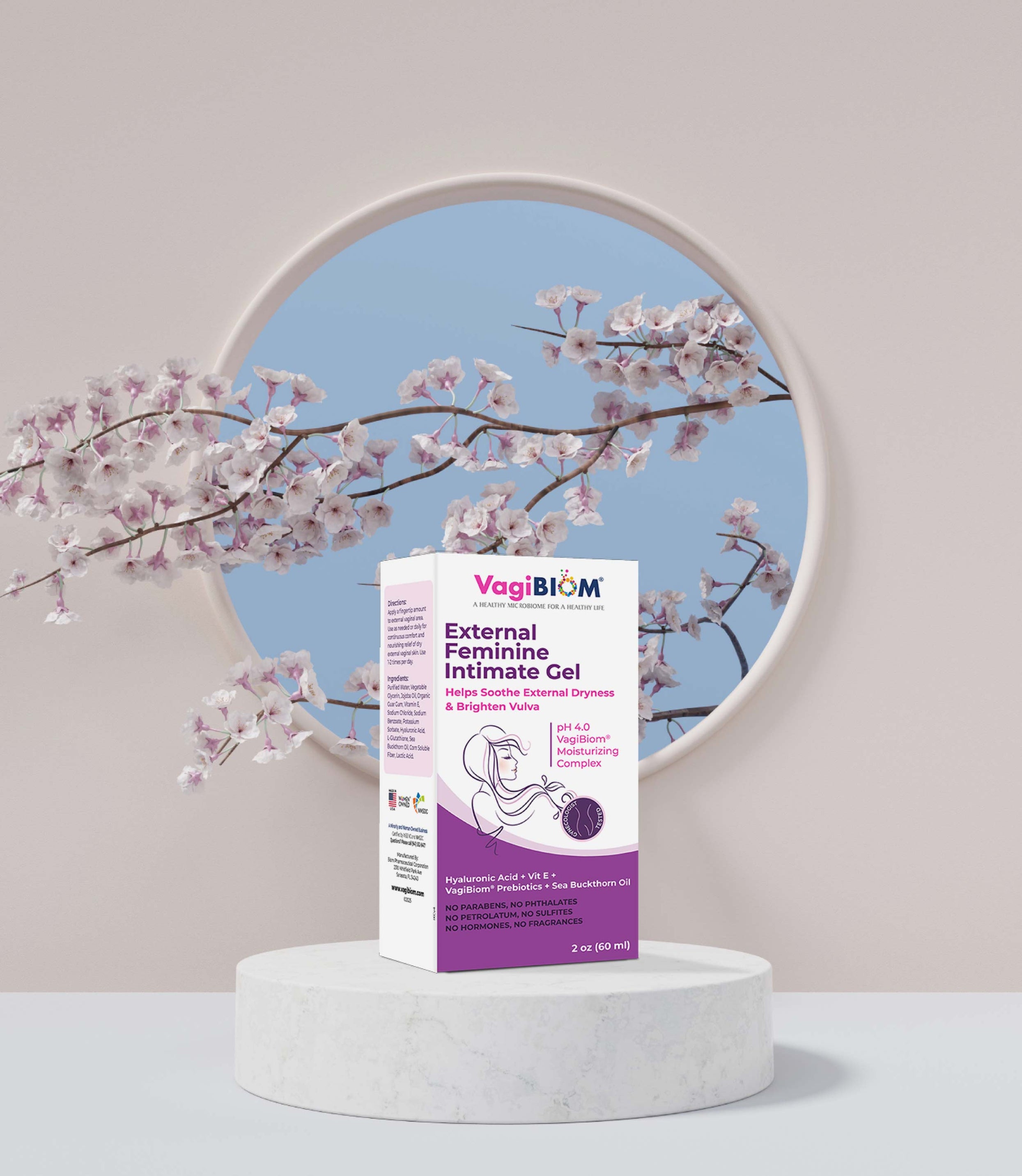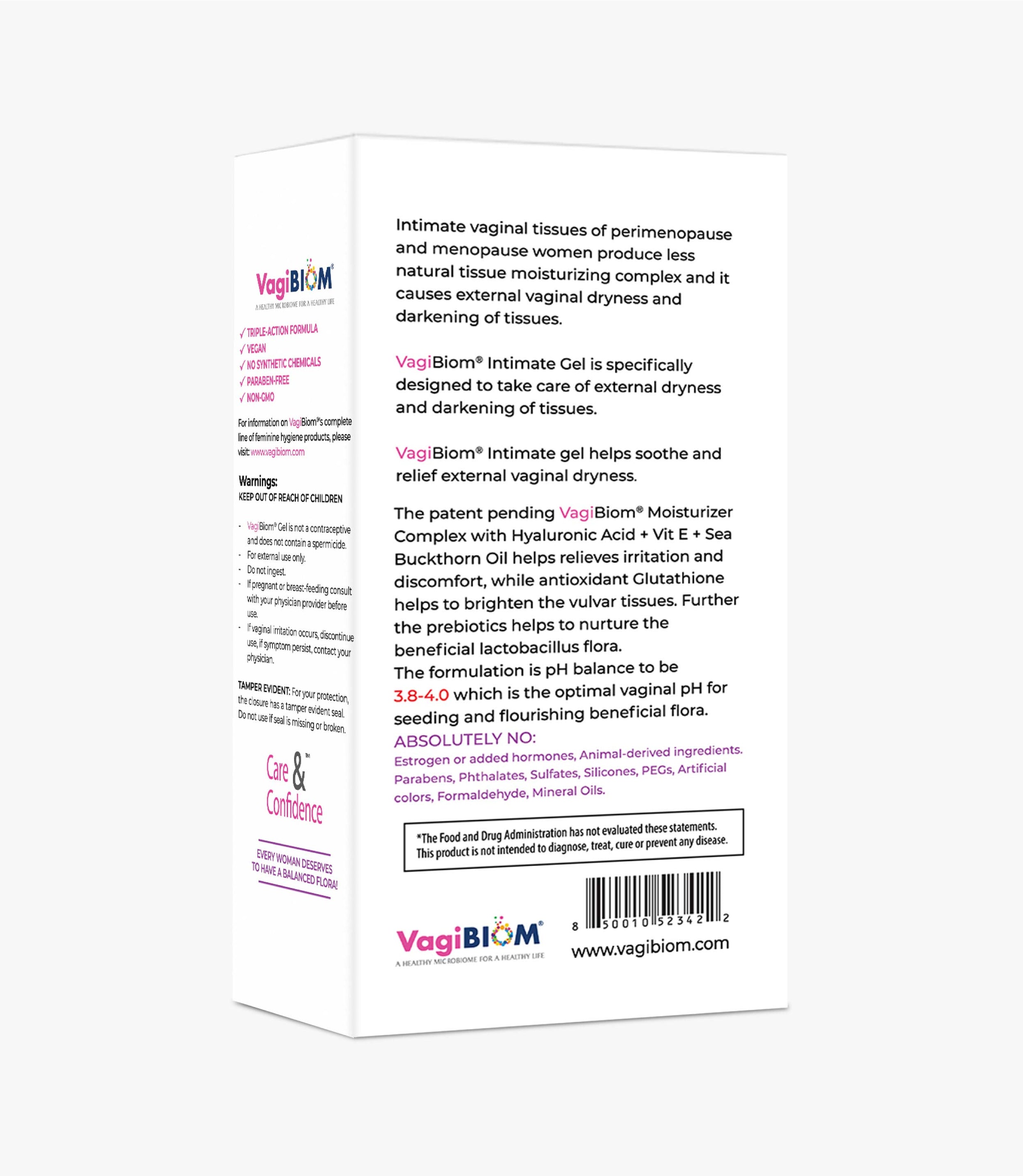 VagiBiom® Feminine Intimate Gel combines the hydrating power of Hyaluronic Acid with the brightening benefits of Glutathione to moisturize and reduce vulvar darkening. This 100% natural formula soothes dryness, enhances tissue hydration and promotes comfort and confidence for intimacy.
