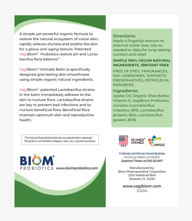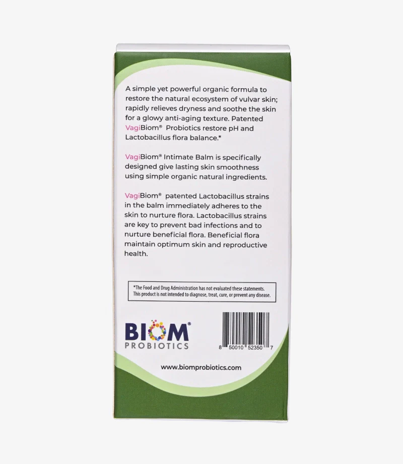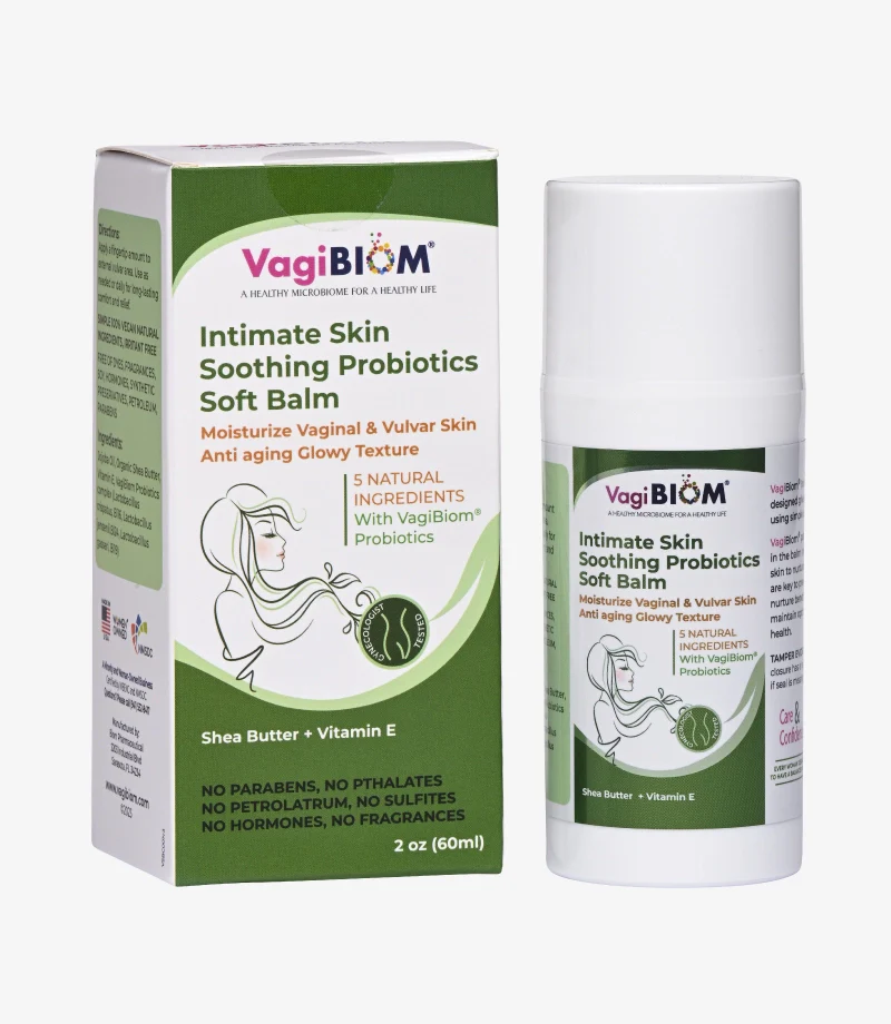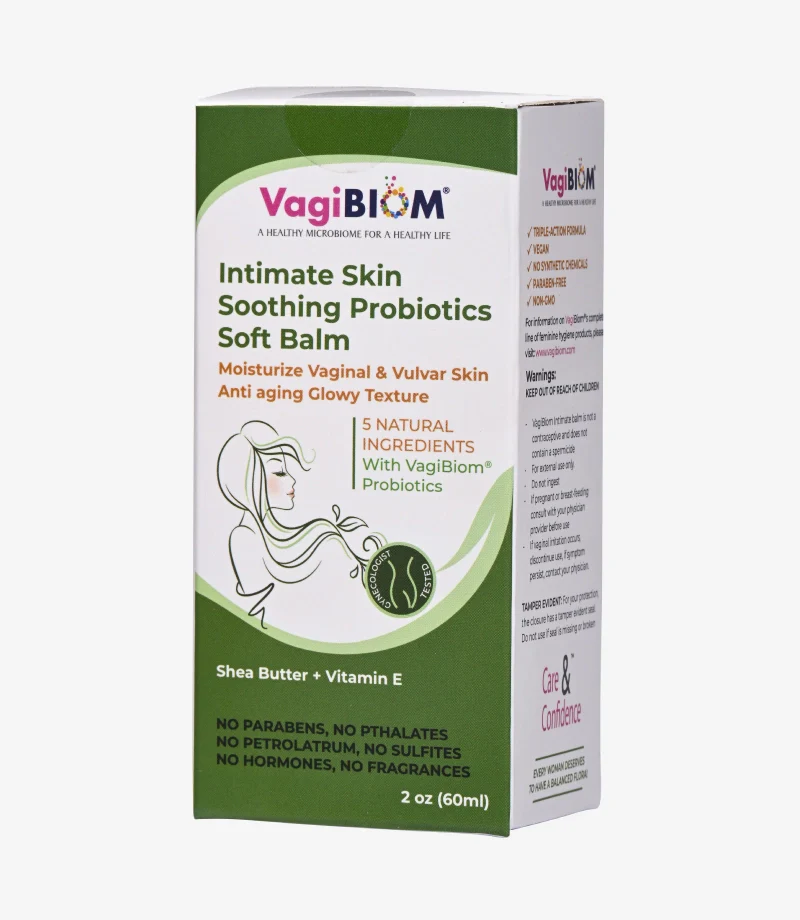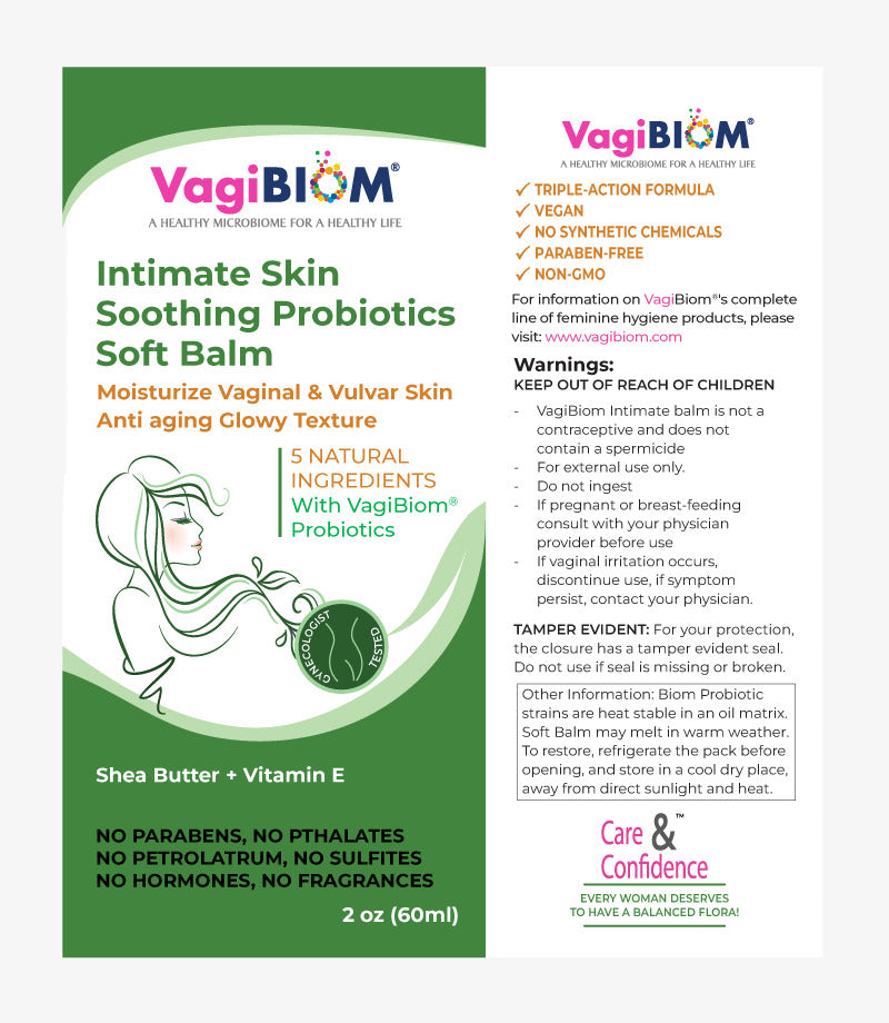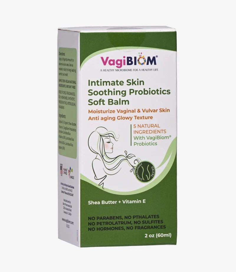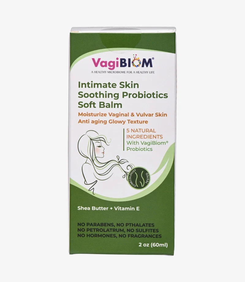 - Why VagiBiom® Soft Balm with Probiotics: Formulated with just five natural ingredients: Organic Shea Butter + Organic Coconut Oil + Organic Candelilla Oil + Vitamin E + VagiBiom® vaginal Probiotics (Lactobacillus crispatus Bi16 and Lactobacillus gasseri Bi19) lubricate the soft vaginal tissues. VagiBiom® Soft balm is specifically designed to help with intimate tissue aging in menopause years.
